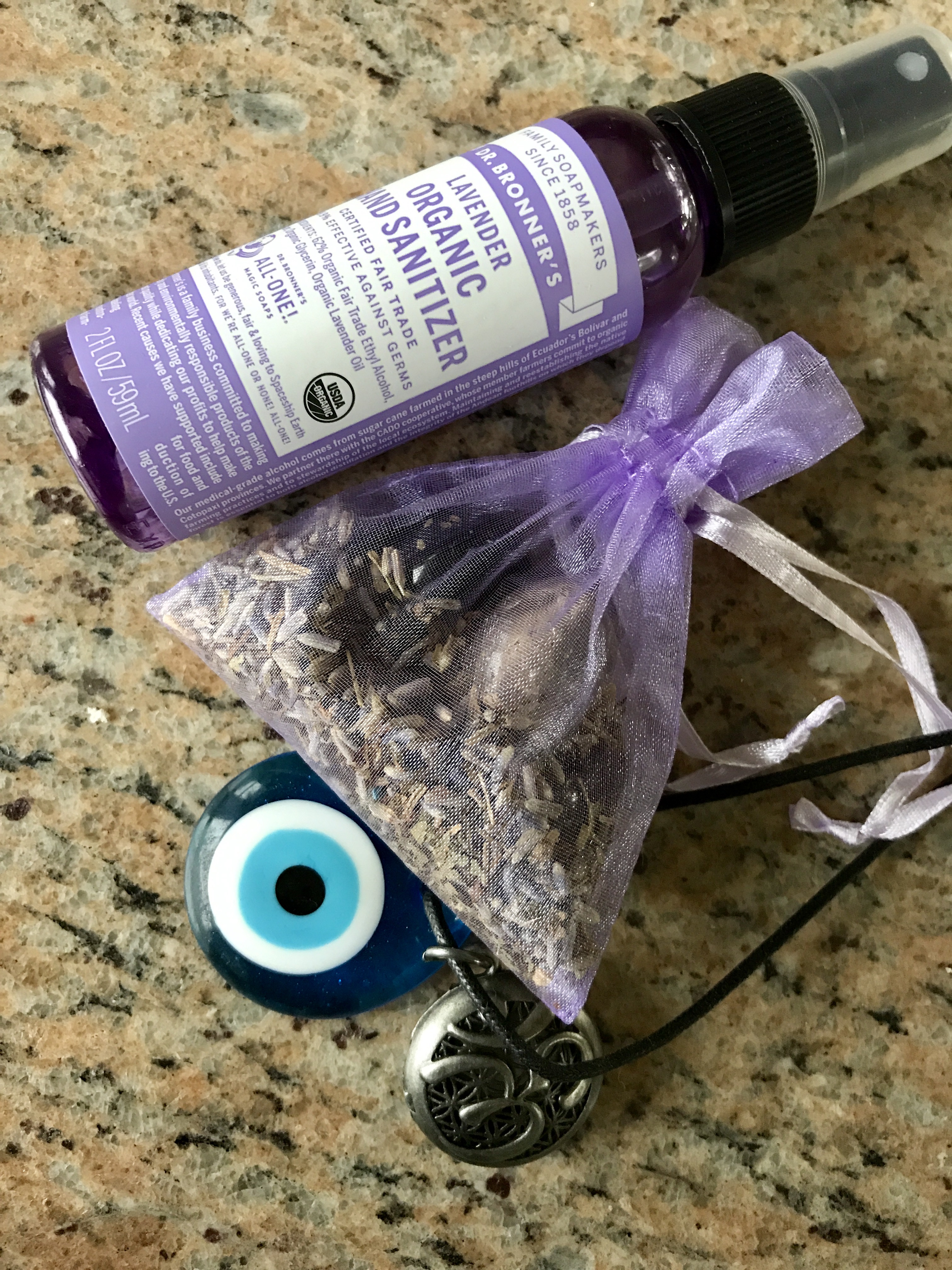 On the same cord with my Nazar talisman, I’ve hung an essential oil locket with the Om [Sanskrit: ॐ] symbol on it (representative of the divine sacred sound of the universe) to diffuse essential oils in my car sacred space. This locket contains a special paper disk designed to hold essential oil scent. I do find that in the intense Florida sun I need to freshen up the oil every few days. Since I know you’re gonna ask, I got mine here. 😉